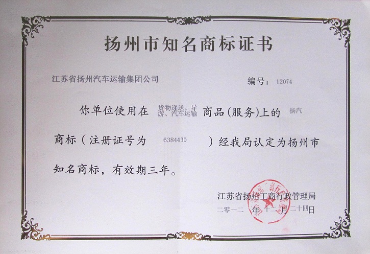 近日,集團(tuán)公司注冊(cè)的證號(hào)為6384430的“揚(yáng)汽”商標(biāo)(貨物遞送、導(dǎo)游、汽車(chē)運(yùn)輸)被揚(yáng)州市工商行政管理局認(rèn)定為“揚(yáng)州市知名商標(biāo)”。