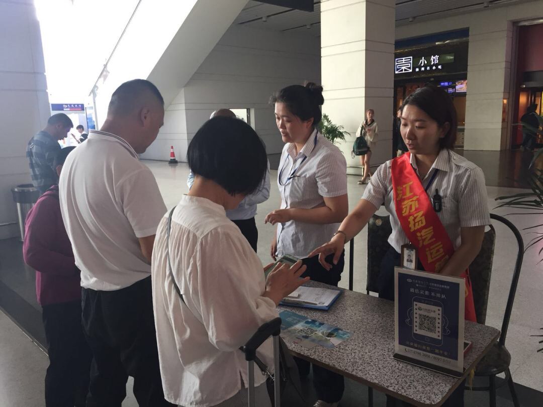 站外,揚(yáng)州站營(yíng)銷小組在火車站下客區(qū)拉起橫幅,身披綬帶開展?fàn)I銷活動(dòng),推廣旅游包車業(yè)務(wù)和行包快運(yùn)業(yè)務(wù),免費(fèi)為過(guò)往旅客提供咨詢、兌換零錢、引導(dǎo)候乘等服務(wù)。讓外地來(lái)?yè)P(yáng)的旅客對(duì)揚(yáng)汽集團(tuán)有了直觀的了解,感受到了我們熱情周到的服務(wù)。