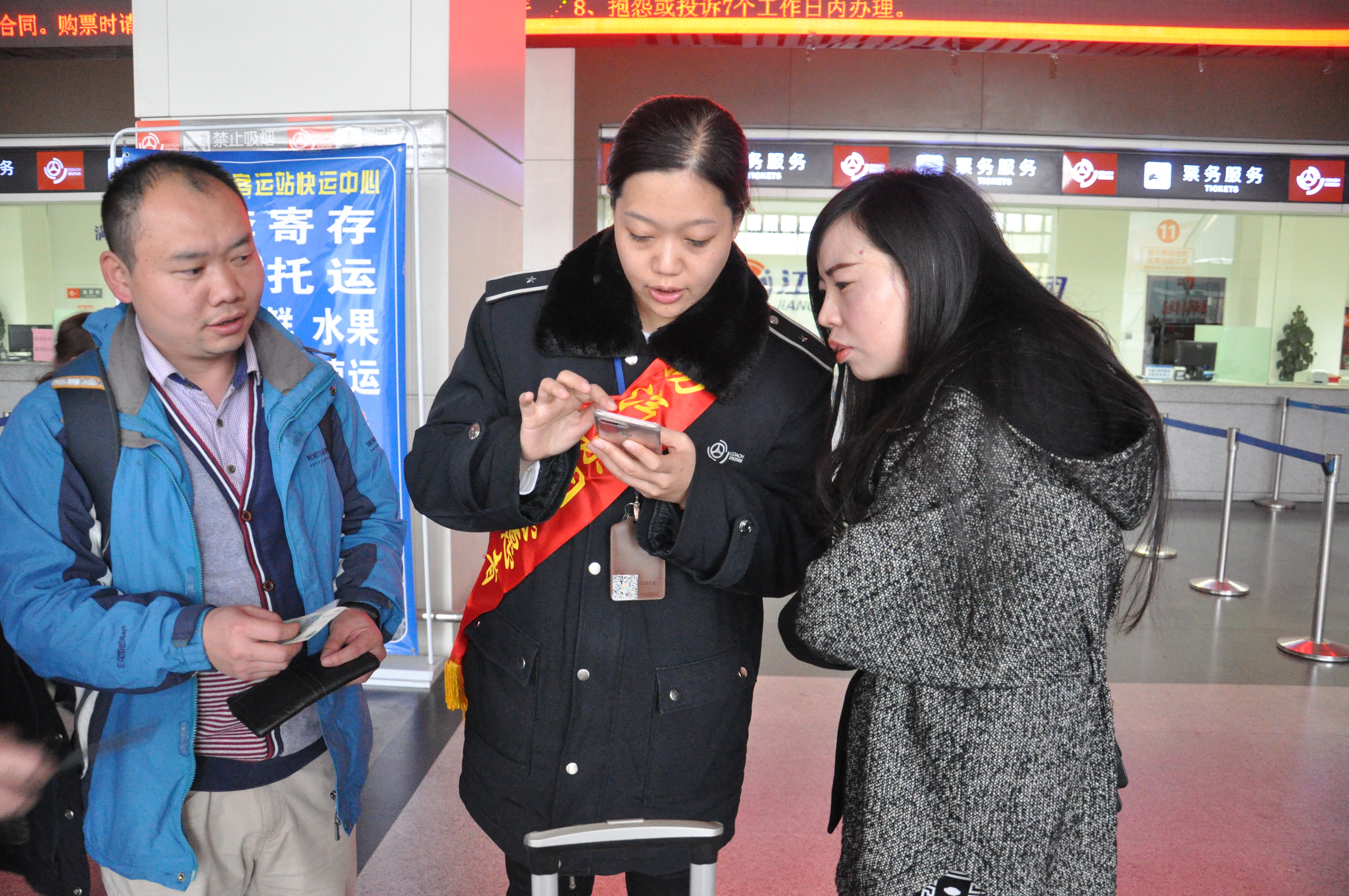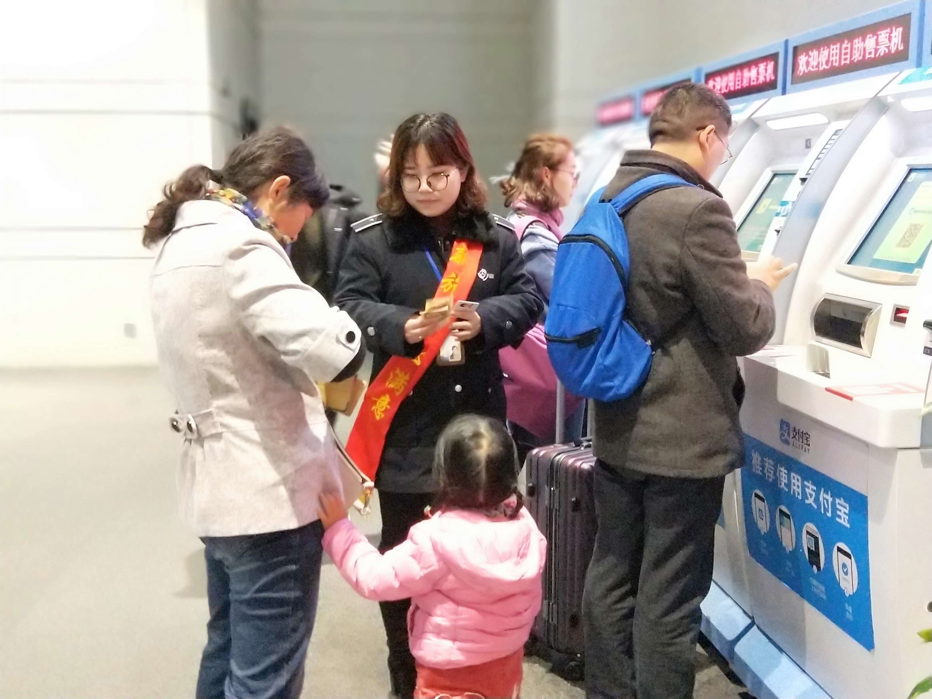 在售票大廳里,有一支身披“新旅途 心滿意”綬帶的工作人員隊(duì)伍,正在有條不紊地引導(dǎo)著前來(lái)購(gòu)票的旅客,通過(guò)手機(jī)或者自助機(jī)的形式進(jìn)行購(gòu)票。原來(lái),車(chē)站現(xiàn)場(chǎng)按照站長(zhǎng)室近期重點(diǎn)工作的部署,主動(dòng)在客流放緩的情況下有序進(jìn)行售票自助化、智能化的嘗試。下午3點(diǎn)現(xiàn)場(chǎng)除退票窗口外,其余窗口臨時(shí)停售,售票員紛紛走出售票窗口,將導(dǎo)乘、購(gòu)票功能前置。