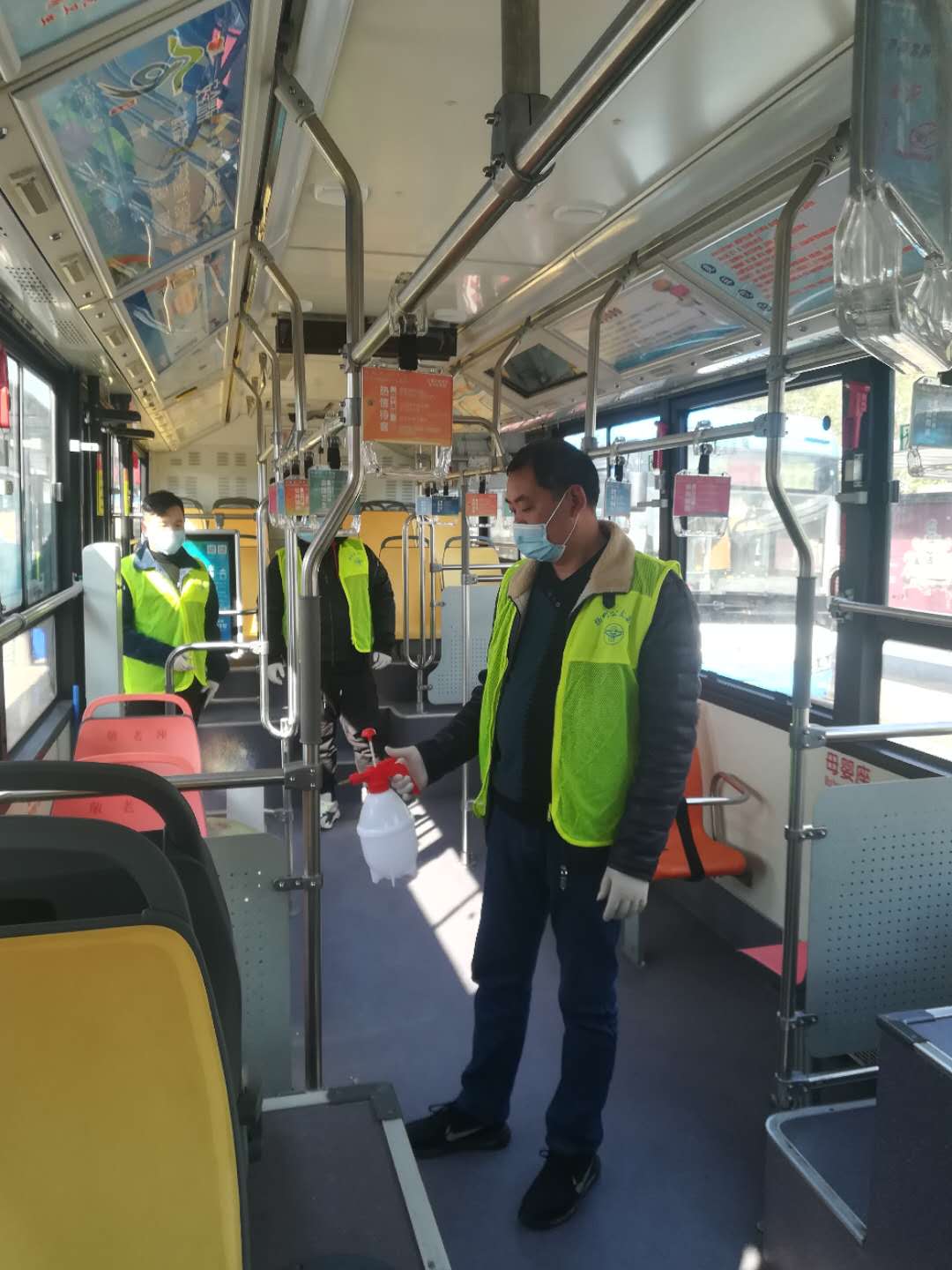 崗前培訓(xùn)后,志愿者們分工明確,在公交站的志愿者們拎著手持噴壺對待恢復(fù)營運線路車輛的地面、扶手、座位進行消毒工作,確保做到不留死角;在車站的志愿者們,協(xié)助車站工作人員做好旅客引導(dǎo)工作,測量體溫、以及掃碼登記等。