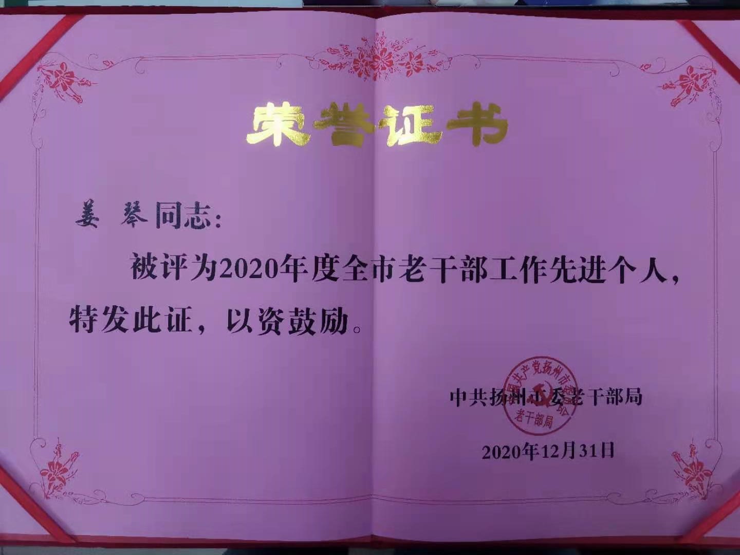 姜琴同志獲“2020年度全市老干部工作先進(jìn)個(gè)人”稱號(hào)