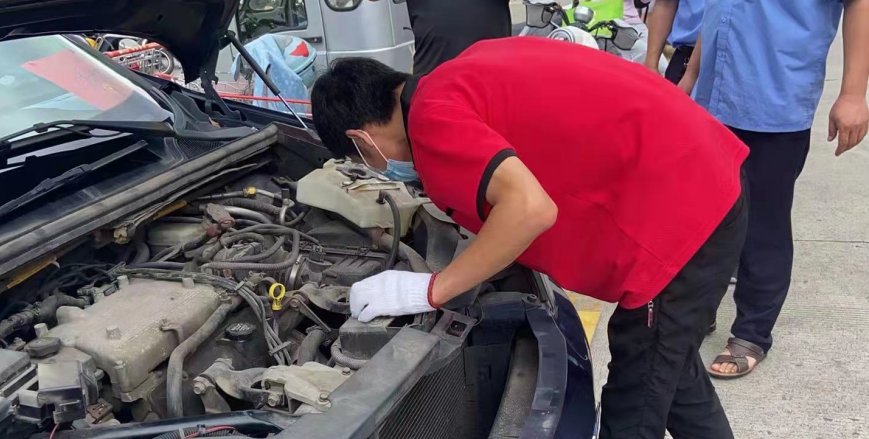 8月14日中午13.00,接到廠部電話通知,因疫情來揚州支援的南京公務(wù)車輛因水溫過高而無法行駛停在⻄區(qū)大潤發(fā)停車場 ,得知情況后許學(xué)仁又主動請纓前去搶修,他立即與車主取得了聯(lián)系并向車主詢問車輛故障現(xiàn)象,隨后和同伴馮琪準(zhǔn)備好工具便出發(fā)。趕到現(xiàn)場后,他們對⻋輛進(jìn)行了檢修,從而發(fā)現(xiàn)水箱爆裂導(dǎo)致水溫升高,隨即聯(lián)系配件供應(yīng)商,但因疫情和道路管控原因配件無法送達(dá),許學(xué)仁自己開車去尋找配件,一同前往的機(jī)修工馮琪便開始對水箱進(jìn)行拆解,兩邊同時進(jìn)行著,展開了一場與時間賽跑的“搶修戰(zhàn)役”,當(dāng)回到救援地點,水箱以拆解好等待安裝,他倆便開始安裝,裝配完畢后開始試車與檢查水溫,水溫正常且風(fēng)扇完美轉(zhuǎn)動,車輛得已運行,他兩露出了開心的笑容。