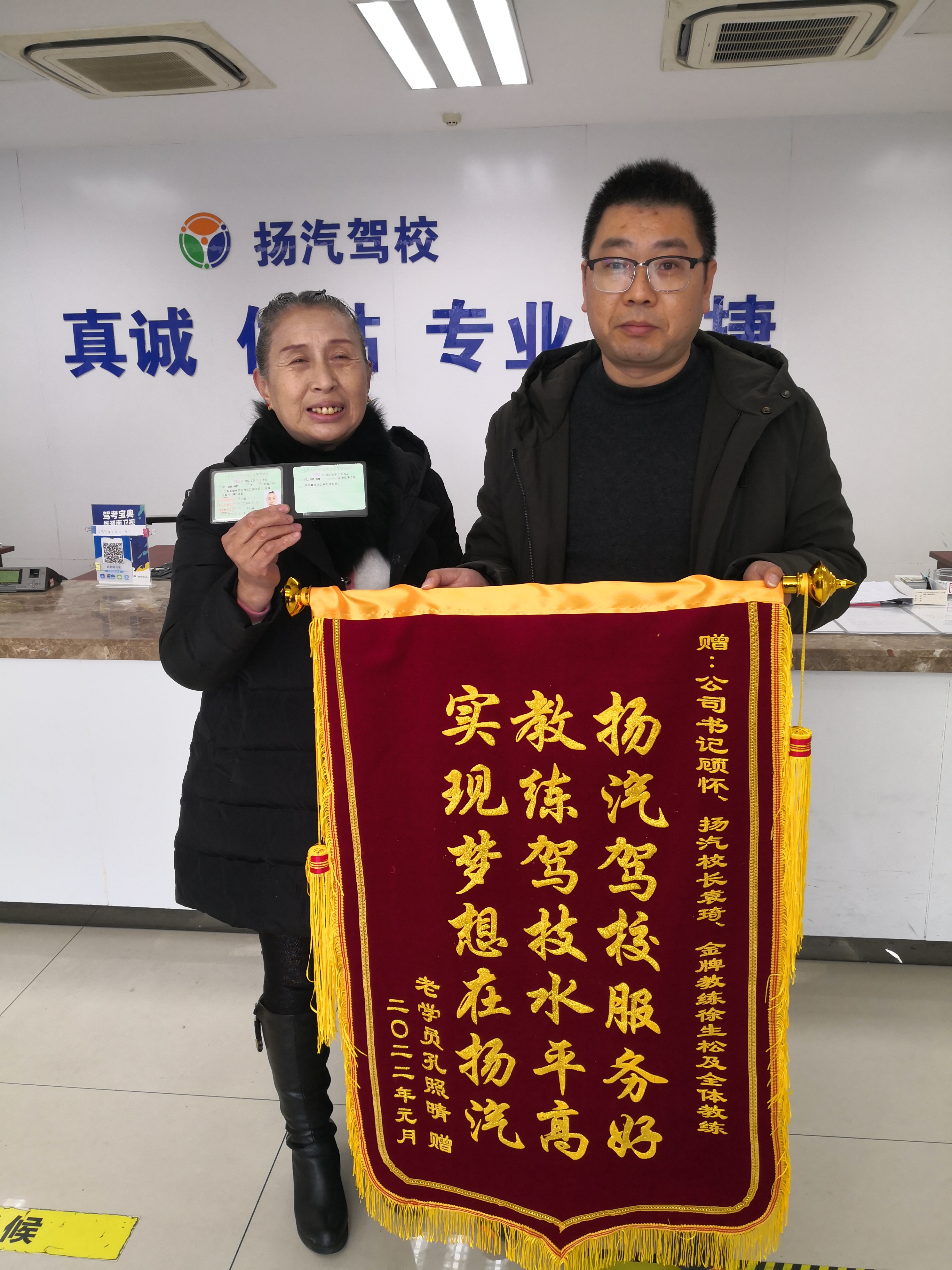近日,67歲的孔大媽滿懷喜悅之情帶著新聞媒體的記者一同來到駕校,領(lǐng)取了她夢寐以求的駕駛證,同時(shí)為駕校送上了“揚(yáng)汽駕校服務(wù)好 教練駕技水平高 實(shí)現(xiàn)夢想在揚(yáng)汽”的錦旗。